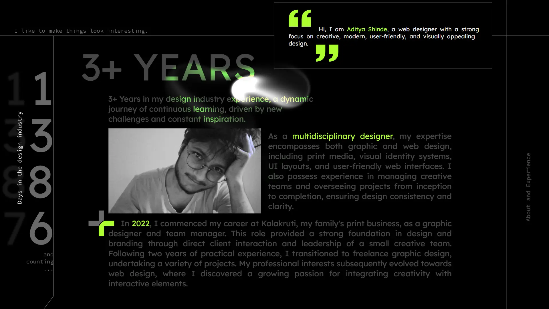 Design decisions focused on clarity, hierarchy, and minimalism, allowing the work and story to take center stage. Interactive animations and WebGL effects were used strategically to provide depth, enhance engagement, and make navigation feel fluid and intuitive. Every movement and effect is purposeful, creating a seamless flow as visitors explore projects, skills, and insights.